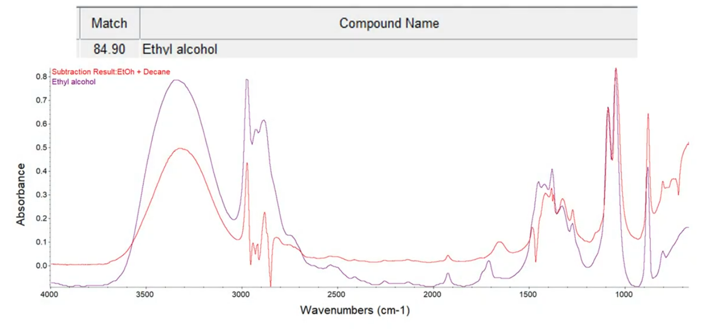 - 이 사례에서는 라이브러리 검색 결과 에탄올(ethanol)이 가장 높은 일치도를 보였습니다.