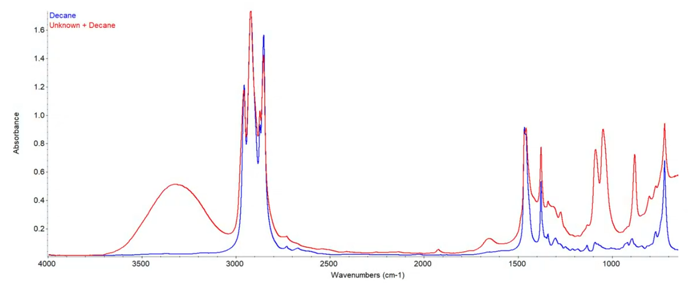 - 이후 데케인에 다른 물질이 혼합된 시료의 스펙트럼을 추가로 측정합니다.