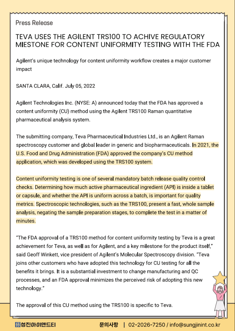 FDA에서는 TRS100 시스템을 사용하여 개발된 TEVA의 함량 균일성(CU) 시험법을 승인했습니다.