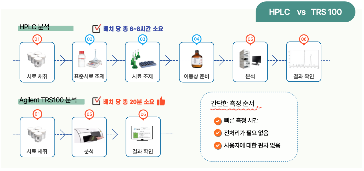 Agilent TRS 100 은 기존 HPLC 분석에 비해 간단한 측정 과정으로 진행이 가능합니다.